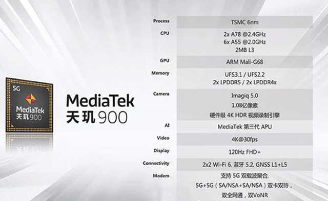 联发科在2021年5月发布最新处理器——天玑900,这颗处理器基于 6nm 先进工艺制造,搭载硬件级别 4K HDR 视频录制引擎,支持 1.08 亿像素摄像头、5G 双全网通和 Wi-Fi 6 连接、旗舰级存储规格和 120Hz 的 FHD + 超高清分辨率显示。