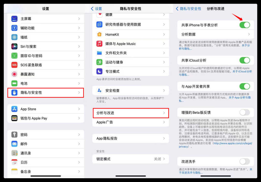 由于查看电池循环次数需要系统分析数据支持,因此我们需要先进入「设置」—「隐私与安全性」—「分析与改进」,打开「共享 iPhone 与手表分析」开关。