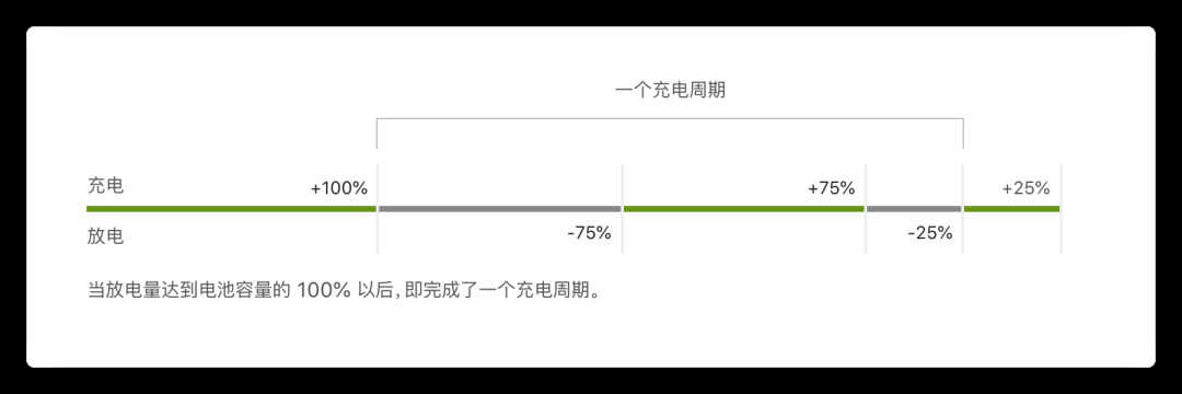 次日继续使用了 25% 后,加上前一天的 75%,总放电量达到 100%,至此累计完成了一个充电周期。