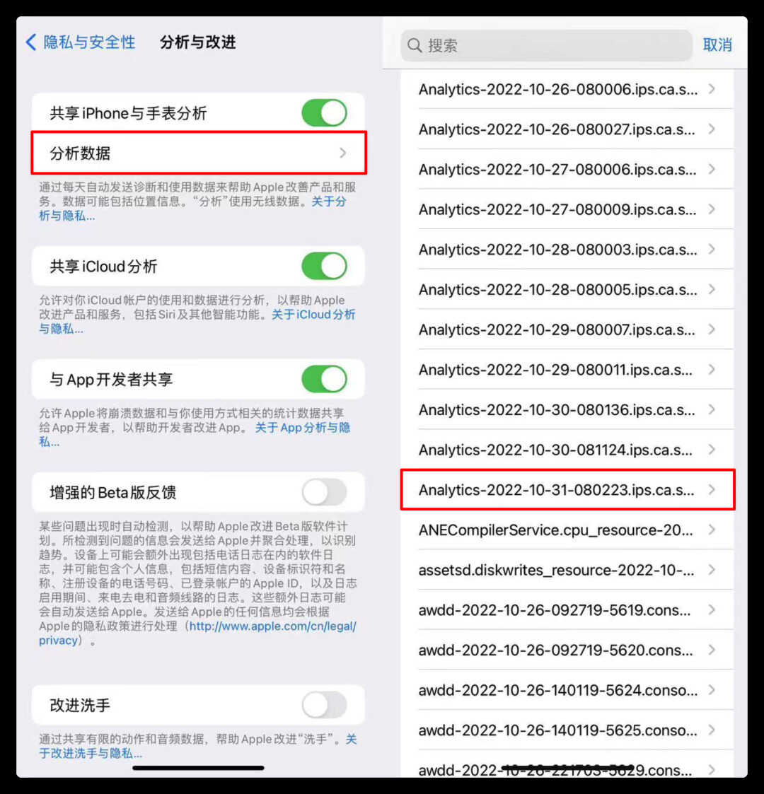 接着我们点击「分析数据」,选择以「Analytics」开头(iOS 15 系统开头为 log-agg),日期最新的文件。