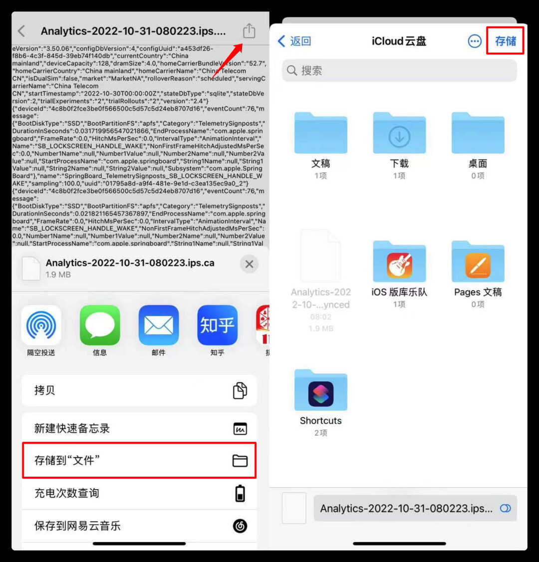 点击右上角的分享按钮,将文件保存至 iCloud 云盘即可。