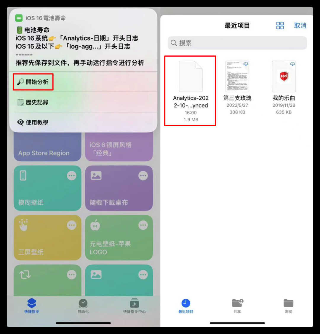 然后我们打开刚才添加的快捷指令,点击「开始分析」,选中刚才保存的文件。