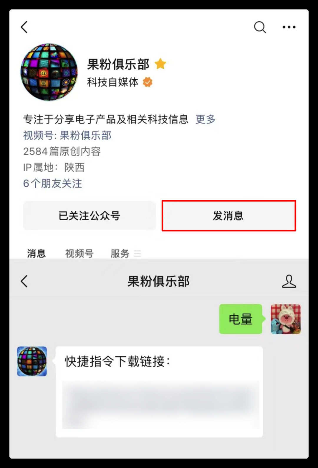 点击右侧下方的「发消息」,回复关键词「电量」获取快捷指令下载链接。