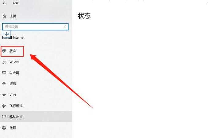 点击进入“网络和Internet”选项,找到“状态”选项。如下图: