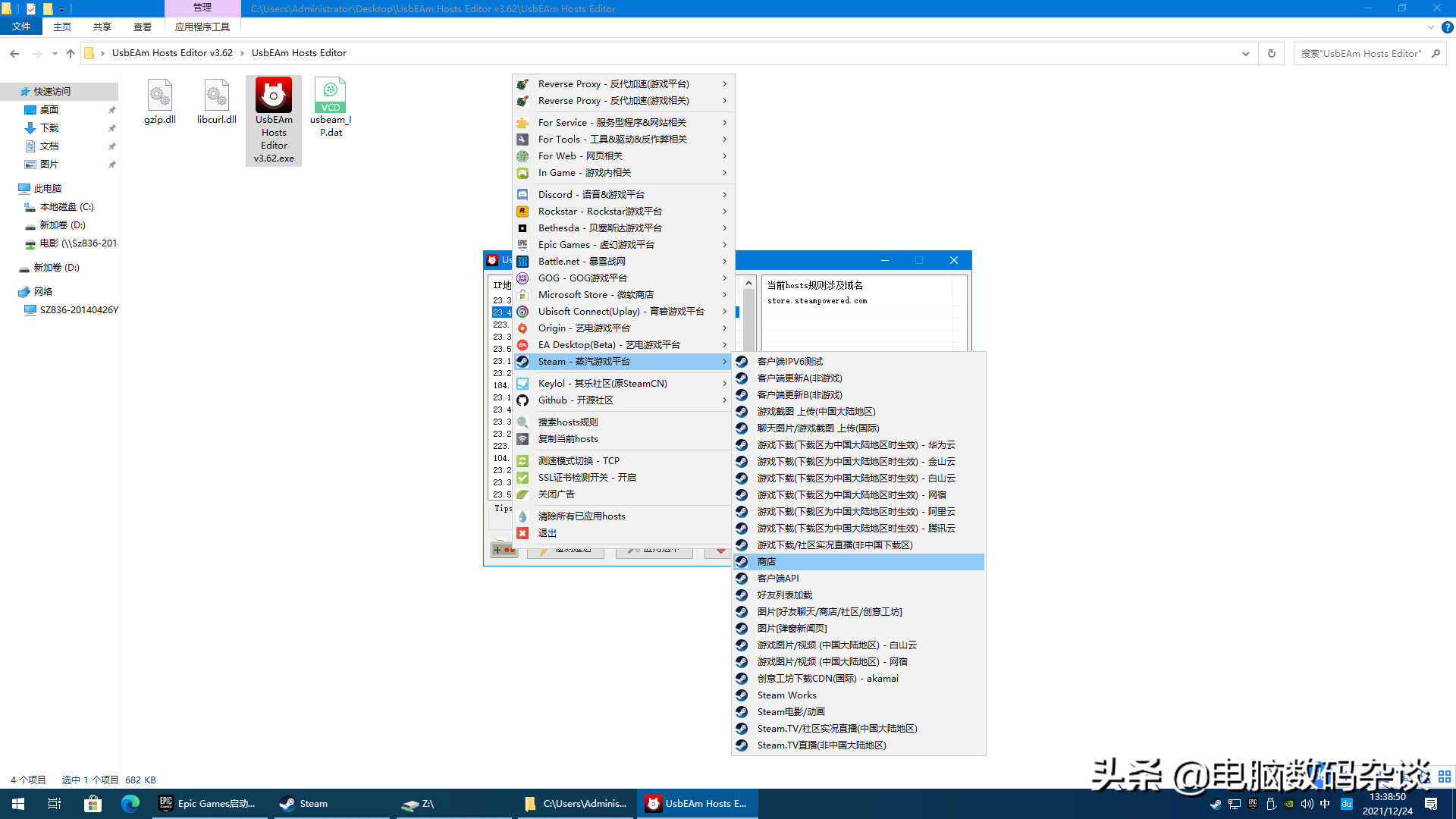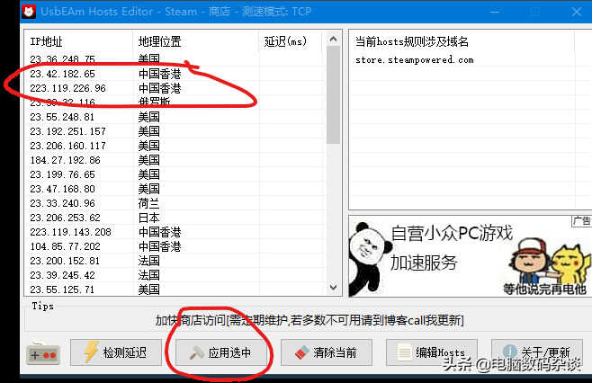UsbEAm Hosts Editor会刷出来很多地区的IP地址,选择好地区点击应用选中,就能自动修改hosts。然后再登录steam看问题有没有解决。