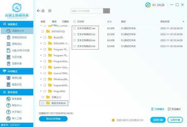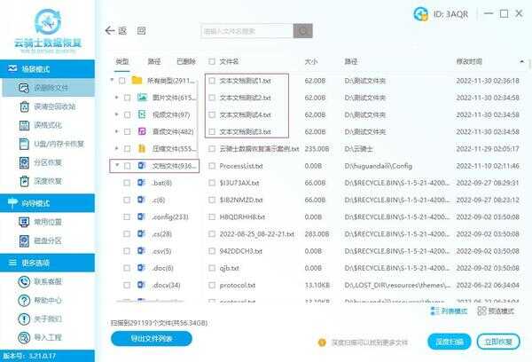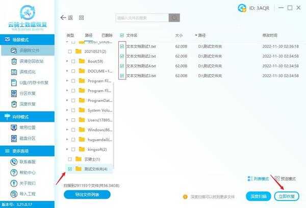找到所需文件以后进行勾选,可直接勾选路径中找到的文件夹,也可以依次勾选文件名前面的方框,然后点击“立即恢复”按钮。