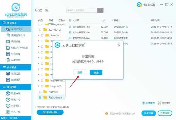 待软件导出完成后点击“查看”,即可在一个命名云骑士的文件夹路径中查看恢复出来的文件了。