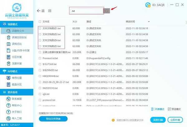 得出扫描结果后,在页面右侧寻找要恢复的文件,可以按文件的类型、文件的名称、文件的路径等来精准搜索。