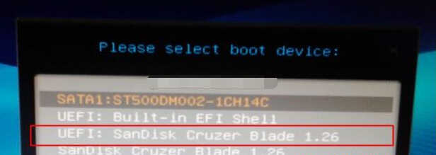 3.以下操作进入u盘启动盘。将u盘插入计算机,插入需要重做系统的笔记本电脑pe启动盘,重新启动,不断按压F12或F11或Esc等待启动快捷键。调整到启动菜单提示框,选择已识别的U盘选项,通常是U盘名称或包含USB字样,例如SanDisk,如果想uefi组装模式,选择带UEFI按回车进入模式项。