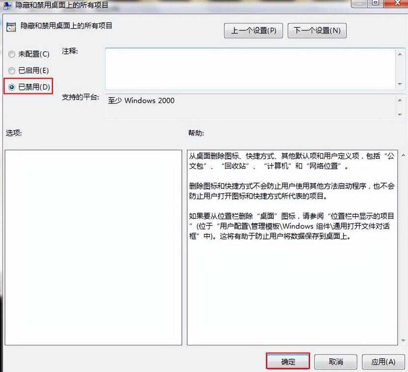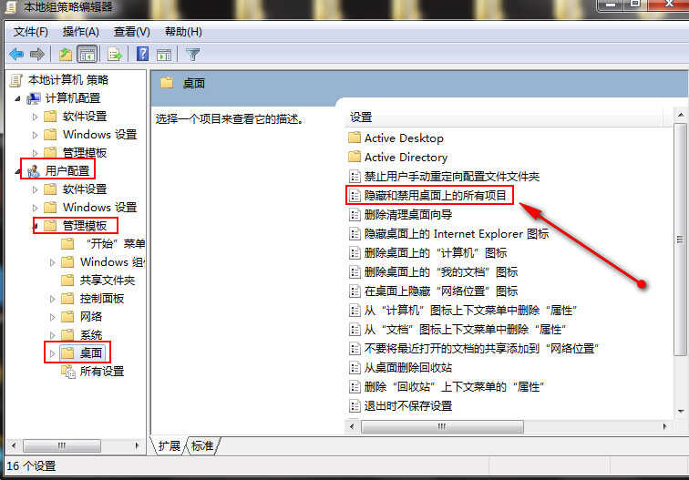 2、依次点击“用户配置-管理模板-桌面”,双击“隐藏和禁用桌面上的所有项目”,如下图所示: