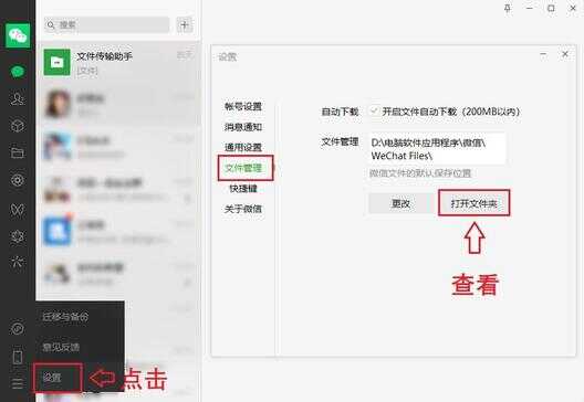 6.你还可以打开电脑端微信,进入【设置】-【文件管理】-【打开文件夹】,这里保存着微信聊天图片、视频和文件。
