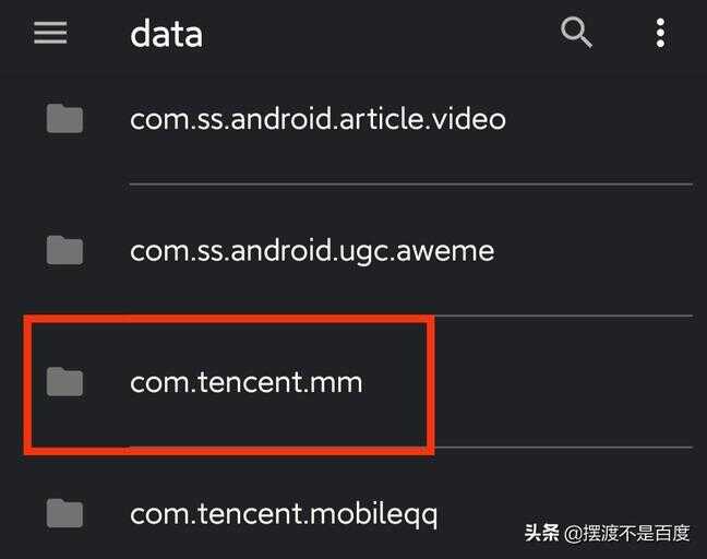 可以看到“data”里面有非常多的文件,一直往下拉,按名称排序的话,差不多在最后面,我们找到“com.tencent.mm”,点开;