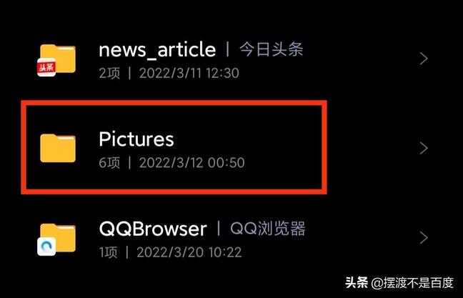 保存的图片、视频和文档文件不在同个路径,回到文件管理首页,找到“Pictures”文件夹,