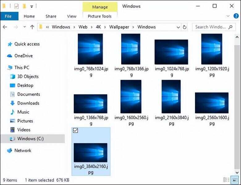 如果您有一台运行旧版 Windows 10 的计算机,您还可以保存一份桌面壁纸的副本。只需前往 C:\Windows\Web\4K\Wallpaper\Windows 即可找到各种分辨率的背景文件。“img0_3840x2160.jpg”文件为4K版本。