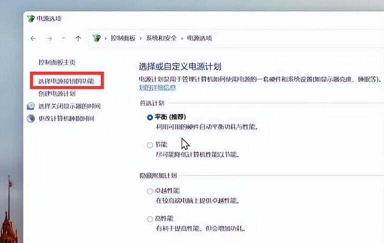 3、在电源选项窗口右侧找到“选择电源按钮的功能”。