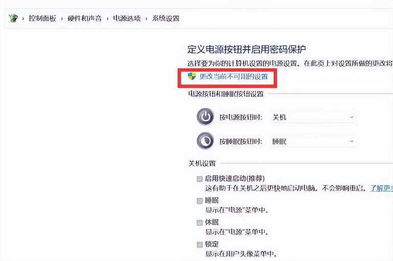 4、鼠标左键单击打开此选项,这时会出现一个系统设置窗口。点击系统设置窗口顶部的“更改当前不可用的设置”。