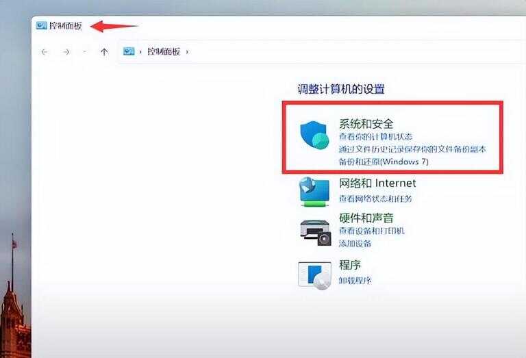 1、首先,点击电脑左下角的开始菜单,在输入框内输入控制面板。打开控制面板选项后,我们在控制面板窗口中找到“系统和安全”。