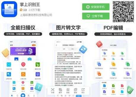 掌上识别王是一款用于文字识别、图片转文字的工具类软件,效果可媲美一般的扫描仪,高识别精准率,使用手机就可以实现识别照片中文字、文字扫描、照片扫描、拍照翻译以及尺寸测量等功能。