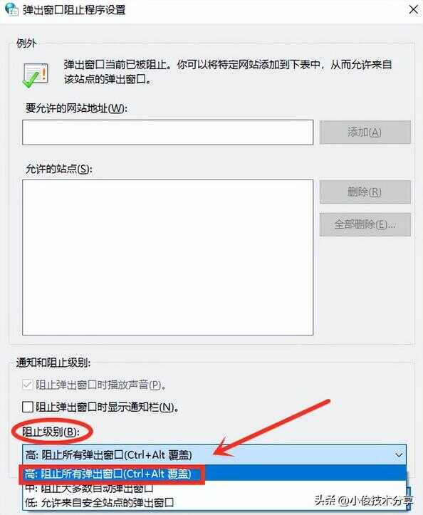 在【设置页面】中,我们直接把【弹出窗口阻止级别】更改为【高】