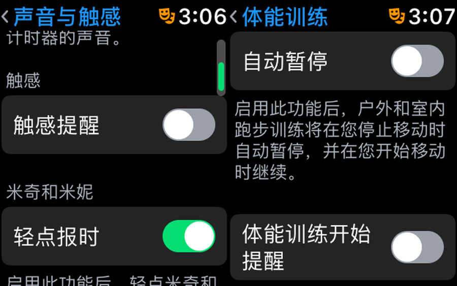 将Apple Watch声音设置的小一点,以及关闭触感提醒,都可以为你的Apple Watch节省不少电量。另外如果你不是经常跑步健身,建议可以关闭体能训练的自动提醒设置了。我曾经因为不小心通过提醒开启Apple Watch的体能训练模式,手表的电量蹭蹭的往下掉;不过体能训练模式关闭后并不影响正常的计步功能。