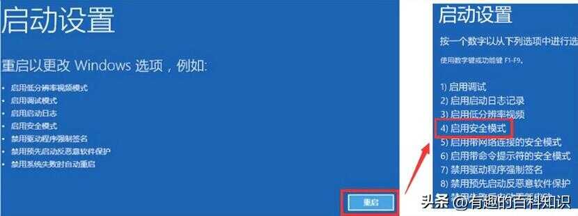 4. 进入启动设置后点击重启--出现界面后按数字键“4”进入安全模式,如下图: