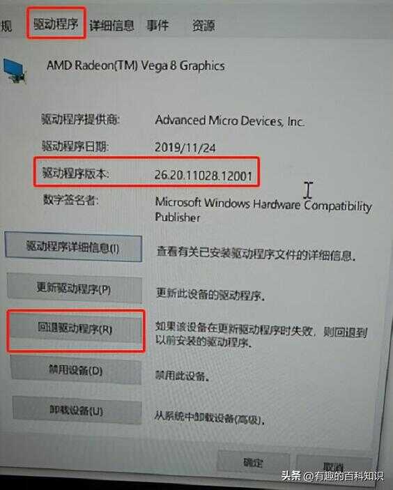 点击“回退驱动程序”,回退后,核实是否回退驱动版本为“26.20.11028.4008”。