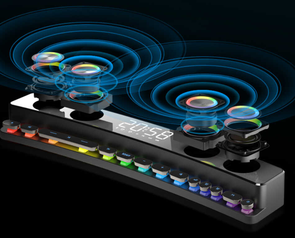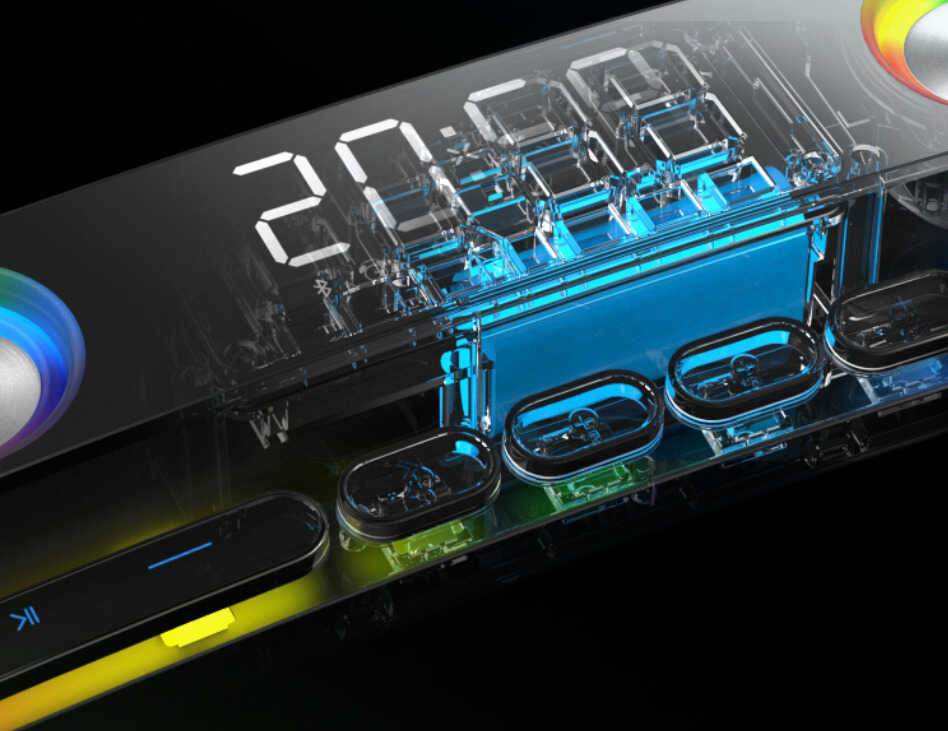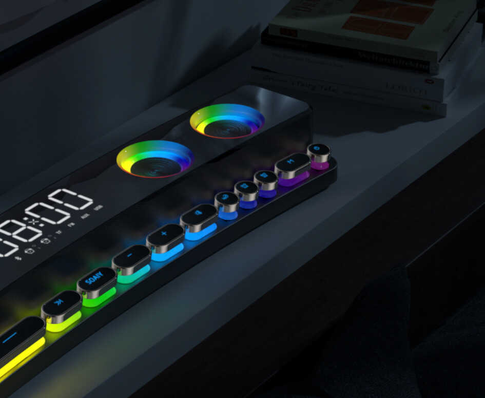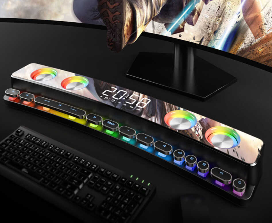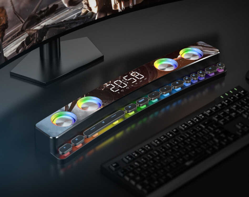 作为一款游戏音箱,索爱SH39整体外形可以说极为炫酷。其外观最吸引人的地方就在于1800R曲面屏和炫彩镭射灯光,彻底告别了以往蓝牙音箱产品刻板的线条及沉闷感,在这样的氛围中玩游戏,仿佛自己就置身游戏世界,临场感极佳。
