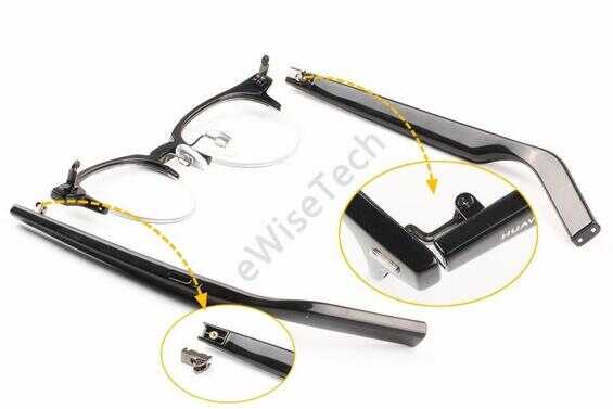 华为智能眼镜3代采用可更换镜框设计,镜脚与镜框之间有合金桩头,采用螺丝固定。眼镜脚合金合叶用螺丝固定,镜脚处使用铜质螺母。