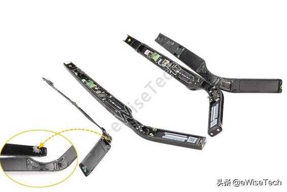 左右眼镜脚内组件由FPC软板、扬声器、主控板和电池组成,所有组件采用双面胶和少量泡棉胶贴合固定在壳内。眼镜脚内侧有少量防水胶,尾部的电池采用点焊方式连接FPC软板,并采双面胶和黑色胶纸固定,连接点表面有透明软胶覆盖。
