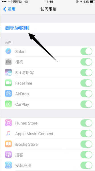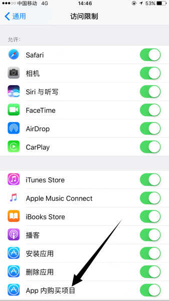 等到打开了访问限制之后就在允许一栏下方找到【App 内购买项目】的选项,直接点击关闭即可。