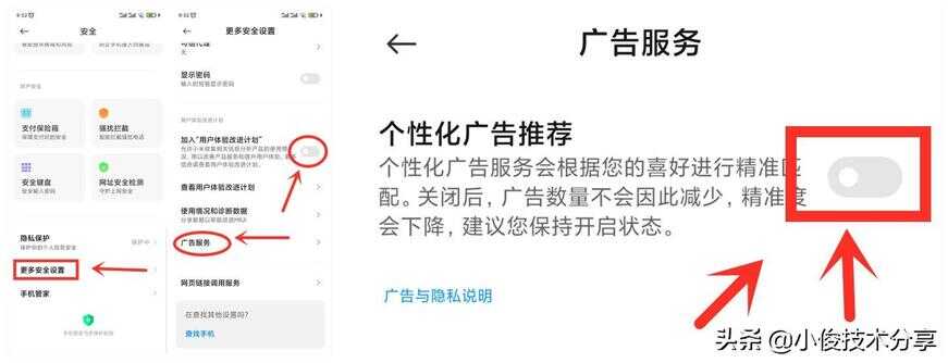 在【安全设置】中选择【更多安全设置】,接着首先把【用户体验计划】关闭,然后点击【广告服务】把【个性化推荐】开关关掉!
