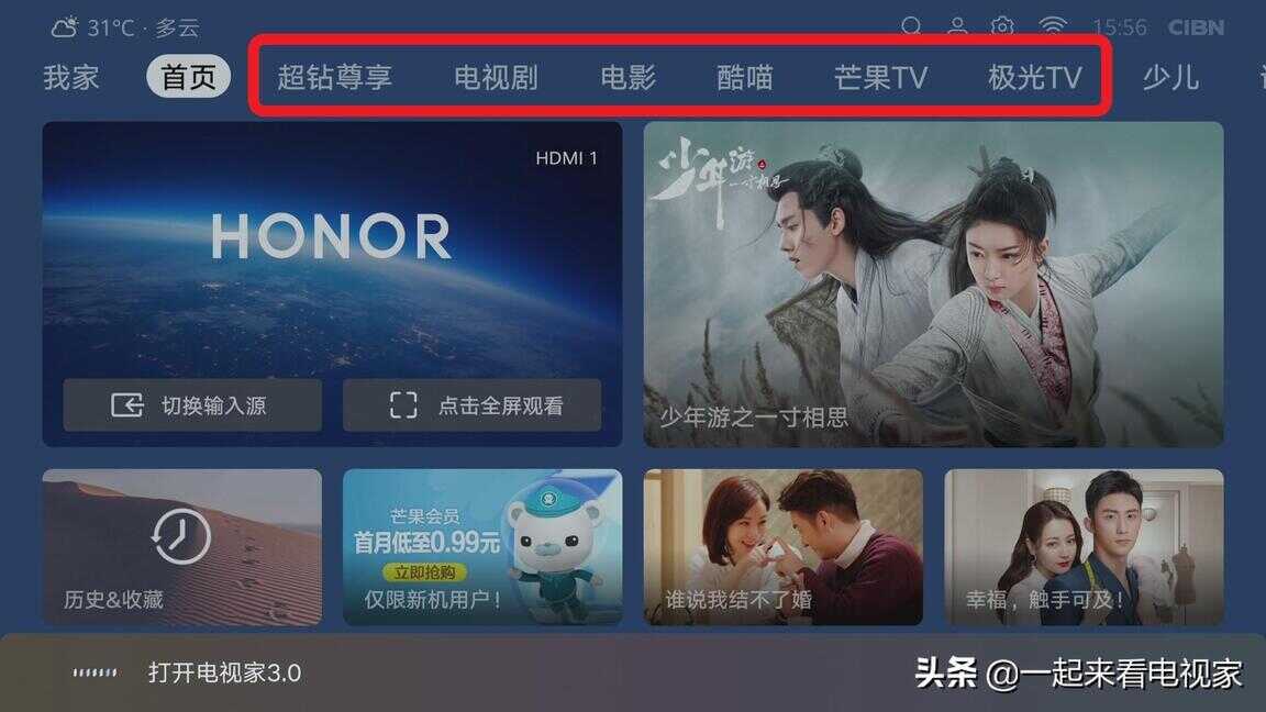 很多人购买了荣耀智慧屏x1,却不知道怎么看电视,其实本身里面是整合了华为视频、酷喵、芒果tv和极光tv四大平台的视频内容的,用户在智慧屏里就可以观看到很多影视综艺,但如果是想要看电视直播,也很简单,只需要安装一款直播软件就可以看了。