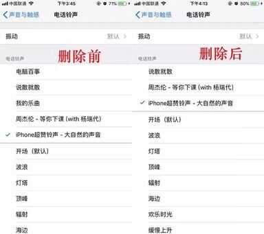 以上就是删除iPhone自定义铃声的2种方法,删除后,大家可以在iPhone的 设置 -> 声音和触控 -> 电话铃声 中,可以看到删除前和删除后的效果,如图所示。