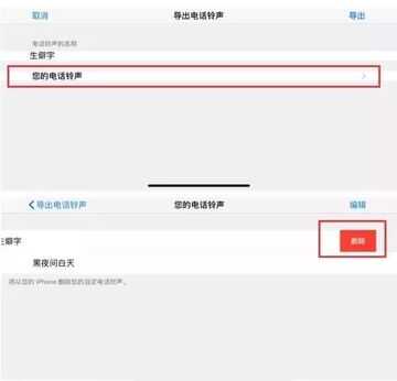 3、接下来在导出电话铃声设置中,选择“您的电话铃声”,之后下方就可以看到之前通过“库乐队”导出的所有铃声,选中想要删除的铃声,左滑一下即可删除,如图所示。