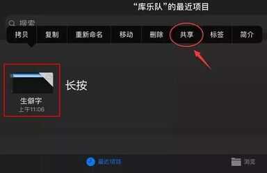 2、然后在“库乐队”中,打开“最近项目”,然后长按任意一段声音,在弹出的选项中,点击“共享”,如图所示。