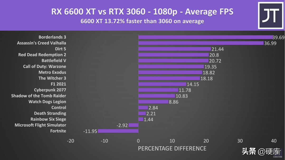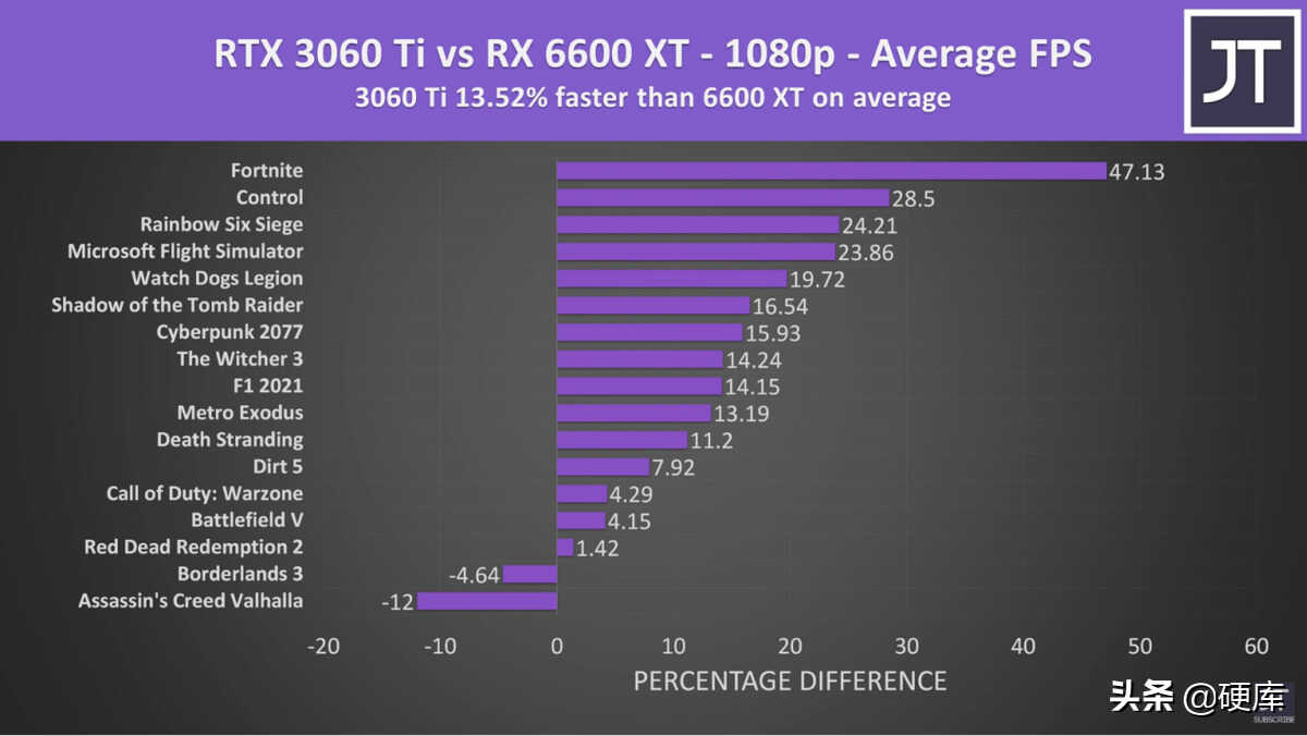 在所有共计17款游戏的对比测试中,1080p分辨率下,6600xt平均比3060领先13.7%,比3060ti落后13.52%。