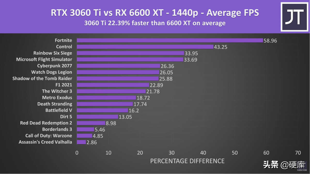 在2k分辨率下,3060比6600xt平均差了6.96%,差距拉近。3060ti比6600xt高了22.39%,差距扩大。这可以说明6600xt在2k分辨率下不太占优势。
