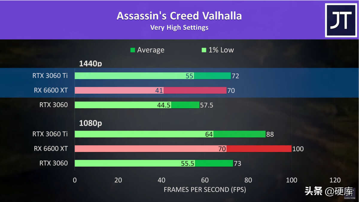 第二个测试的游戏为刺客信条:英灵殿。在这款育碧N黑游戏中,6600xt在1080p下甚至反超了3060ti,比3060ti高了12帧,比3060高了27帧。2k分辨率下,3060ti重回榜一,但只比6600xt高了2帧。6600xt比3060高了12.5帧。