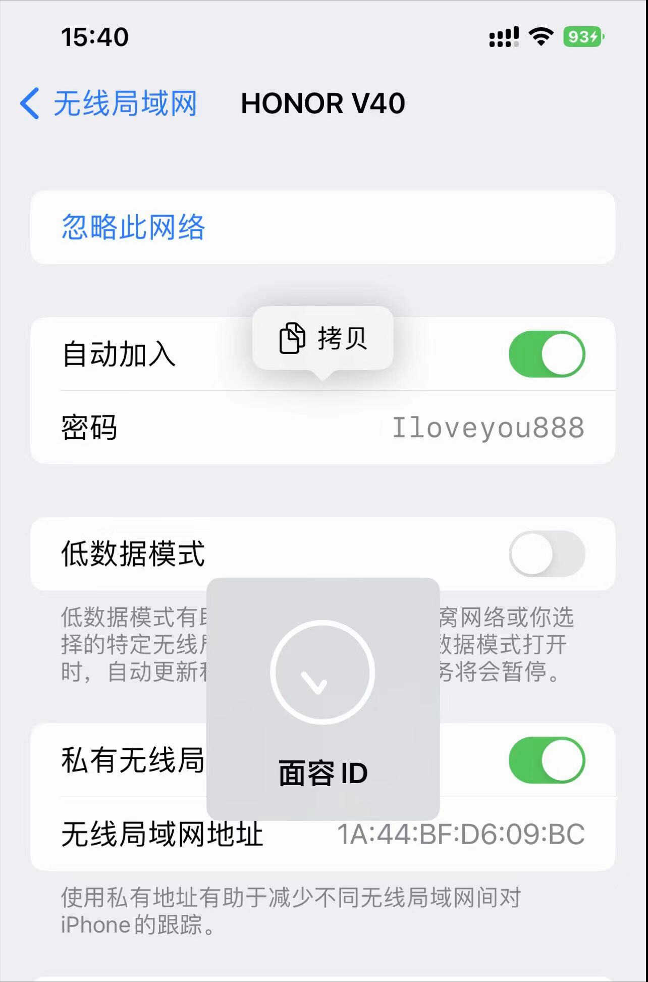 3、点按一下“....”号组成的密码区,这时系统会启用人脸识别验证,验证通过后再显示明文的WiFi密码,此时你就可以看到明文的WiFi密码并且可以拷贝并发送给朋友了。