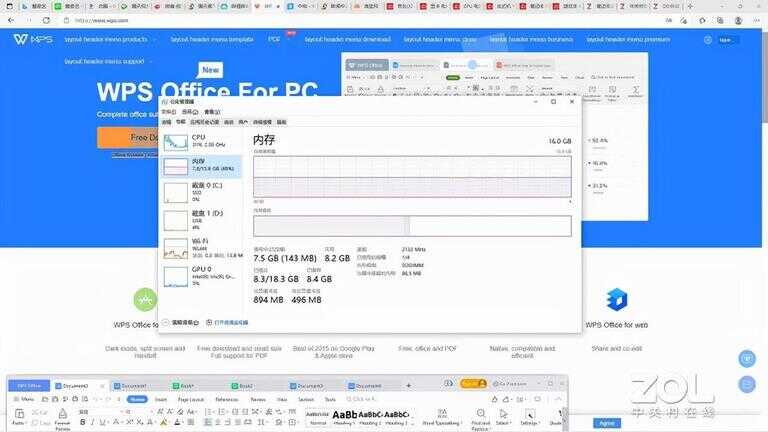 例如我们同时在后台挂微信、钉钉,使用Microsoft Edge打开20个网页,再开启若干个WPS文档,可以看到内存占用就已经达到了8G左右,16GB在日常办公中就相当重要的了。
