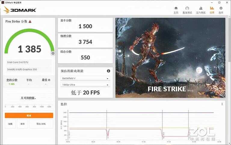 在3DMark基准测试的Fire Strike模式中,GPU获得了1500分,这是一个相当不错的分数了,可以满足轻度的娱乐需求。