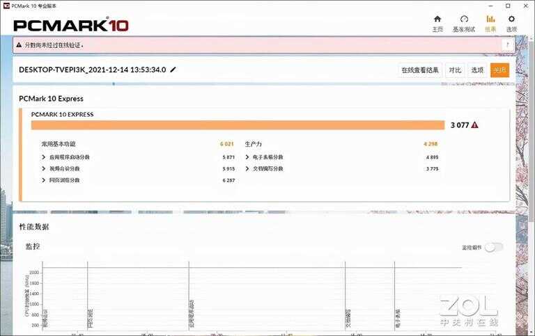 综合办公性能方面,在PCMARK10的Express模式中,总分3077分,其中,在包含应用程序启动、视频会议、网络浏览的常用基本功能部分得分6021分;在包含电子表格、文档编写的生产力部分得分4298分,可以满足日常办公需求。
