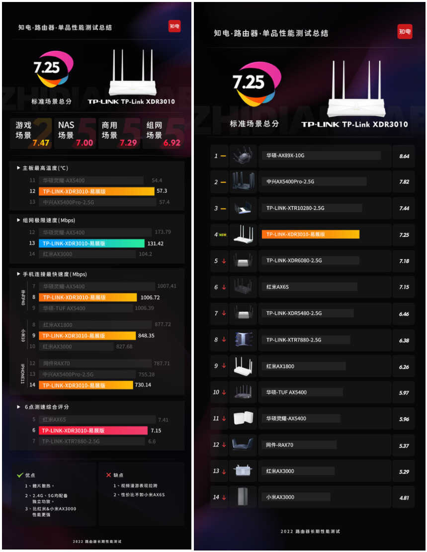 对于TP-Link XDR3010的预期,其实并不高,但实测下来,综合得分7.25分, 在 #ZD Lab# 3.0版本的路由器排行榜中,标准场景综合排名第4。