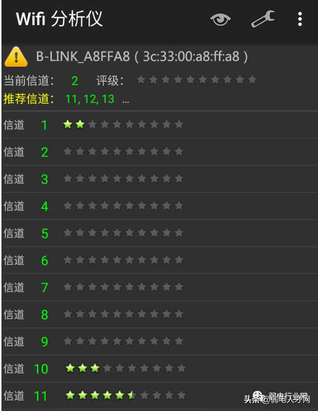 点击右上角眼睛图标,切换到“信道评级”,选择自己的WIFI,这时候APP自动为你推荐了最优的信道,星号越多表示信道越好,干扰越小!