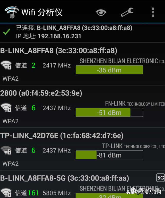 下面是关键的一步,我们怎么知道周围邻居的wifi信号都使用了哪些信道呢?这时候我们要用到安卓手机上的一个利器APP:WIFI分析仪(各大安卓市场应该都能搜到)。