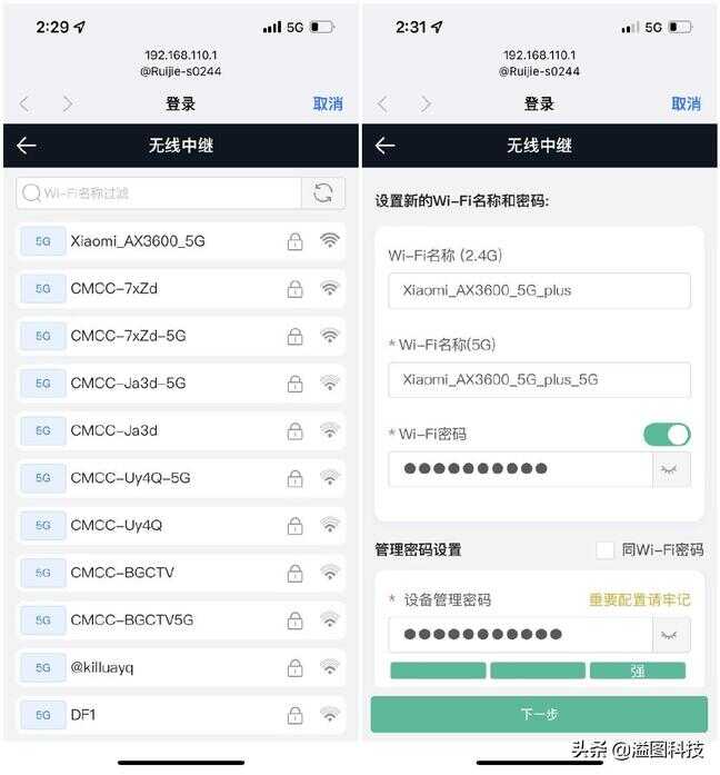 手机连接到锐捷E12Pro的WiFi信号即可进入配置菜单。设置非常简单,只需要选择需要主路由的WiFi信号(最好是5GHz的)并填写WiFi密码,下一步填写一下放大器的WiFi密码和管理密码,点击下一步即可完成中继模式的配置。