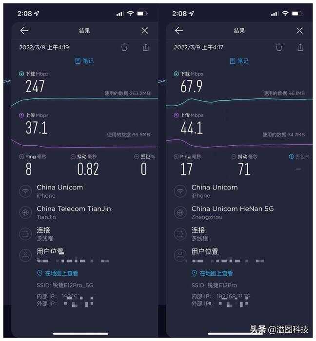 测速方面,在这样的距离上,5GHz信号可以达到247Mbps的下载速度,2.4GHz信号也有67.9Mbps,已经可以很轻松地满足包括4K在线播放在内的绝大多数网络需求了。丢包率和延迟都表现非常优秀,信号质量和稳定性良好。