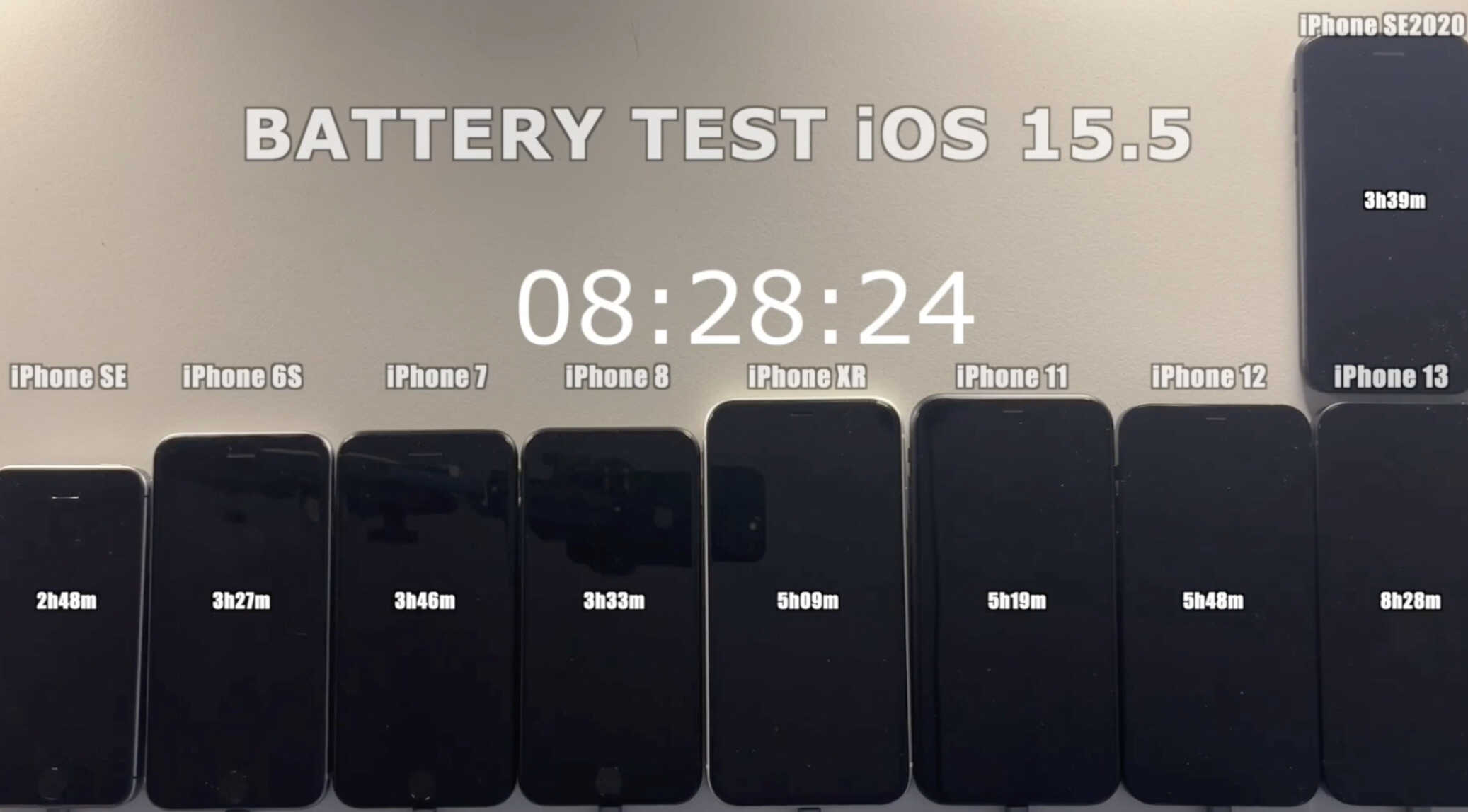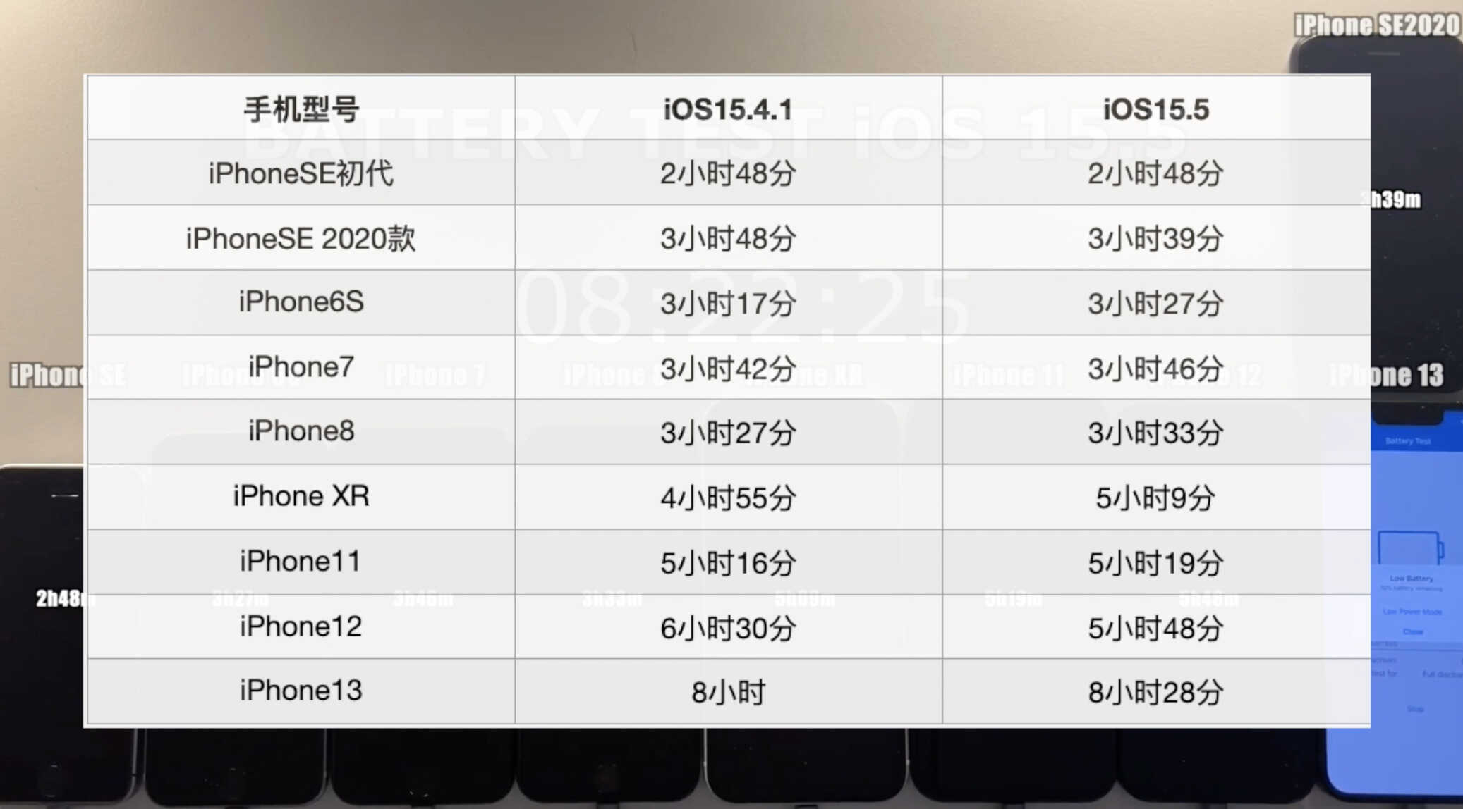 接下里将所有手机更新到了最新的iOS15.5系统,我们再来看一下这9款iPhone的表现吧,对比两次实验的结果来看,大部分苹果手机的续航时间变长了,不过幅度不大,其中iPhone13续航时间多了28分钟,甚至一些老款机型,比如iPhone8/iPhone XR也有轻微的提升。