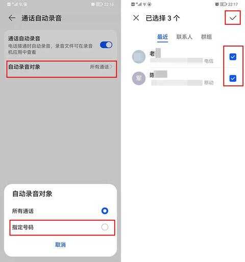 在【通话自动录音】设置界面,点【自动录音对象】选项,就会进入一个设置界面,其中有一个选项为【指定号码】,点击【指定号码】就会出现我们手机通讯录里的所有联系人,勾选你需要“通话自动录音”的联系人,点右上角的钩完成即可,设置好后,你每次和这几个人打电话,都会自动进行录音,并保存到你的手机里。