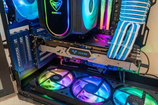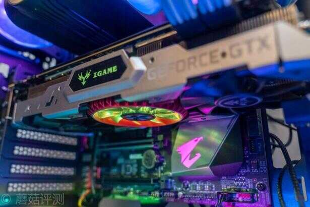 ▼靠近看看,显卡侧面的IGAME的LOGO亮起来还挺好看的,灯光很柔和,没有漏光